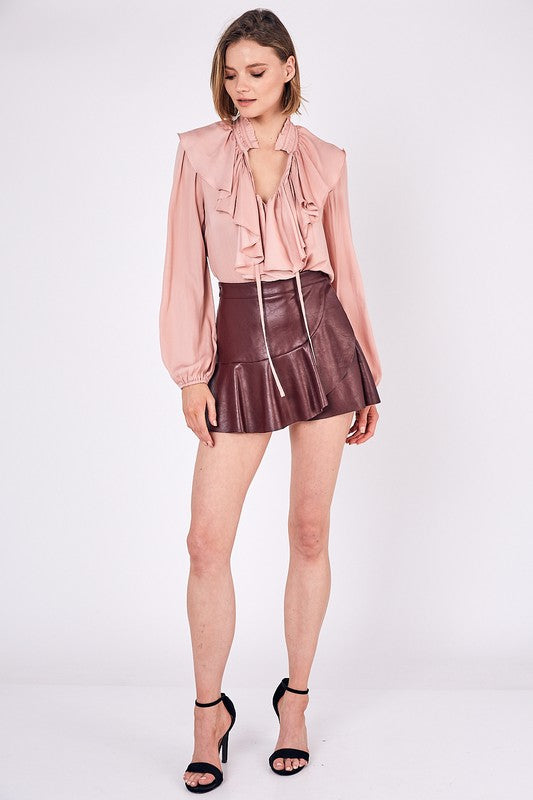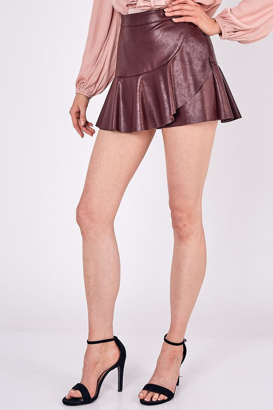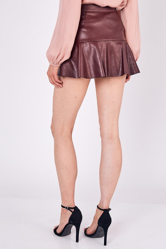 The sexiness of a skirt, but the security of shorts all combined with a wine colored faux leather flouncy fit?! Three words... ADD TO CART. You will not be sorry! Dressed up with a body suit and heels, or dressed down with a graphic and some booties, our Colie leather ruffle skort is a faux leather must have!