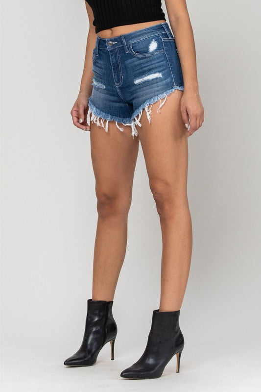 High rise, v cut, distressed, raw hem shorts. Stretchy and TTS,!! Total tush coverage.