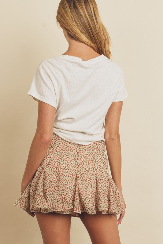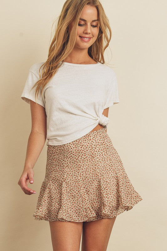 Ditsy Floral mini skirt featuring a flared ruffle hem, and shorts lining. Hidden side zipper closure.