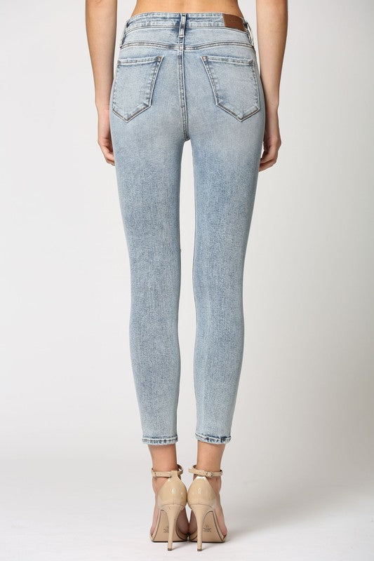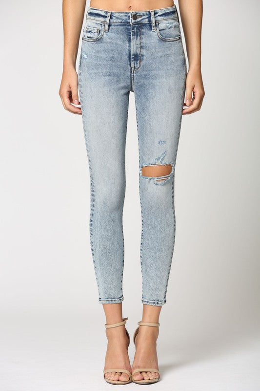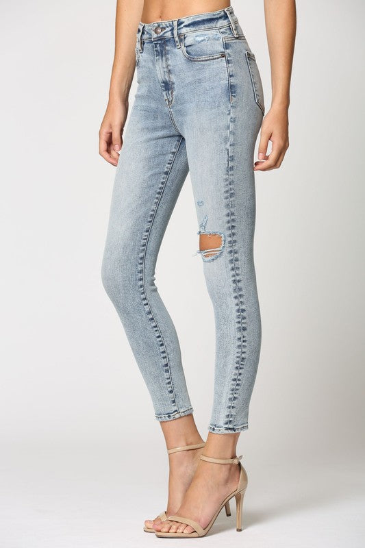 Quite possibly the best fitting jeans you'll ever try on! These acid wash skinny jeans are high rise and feature distressing on the knee. Vintage acid wash jean perfection! They even give your tush a boost... that's how good they are. Super flattering fit and can be dressed for day or night.