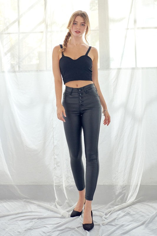 Your search for the perfect faux black leather pants is over!! The Lizette pants are high rise, button front, belt friendly and skinny fit. They are beyond figure flattering. Fit TTS!
