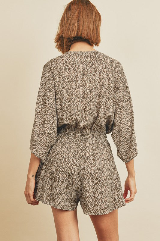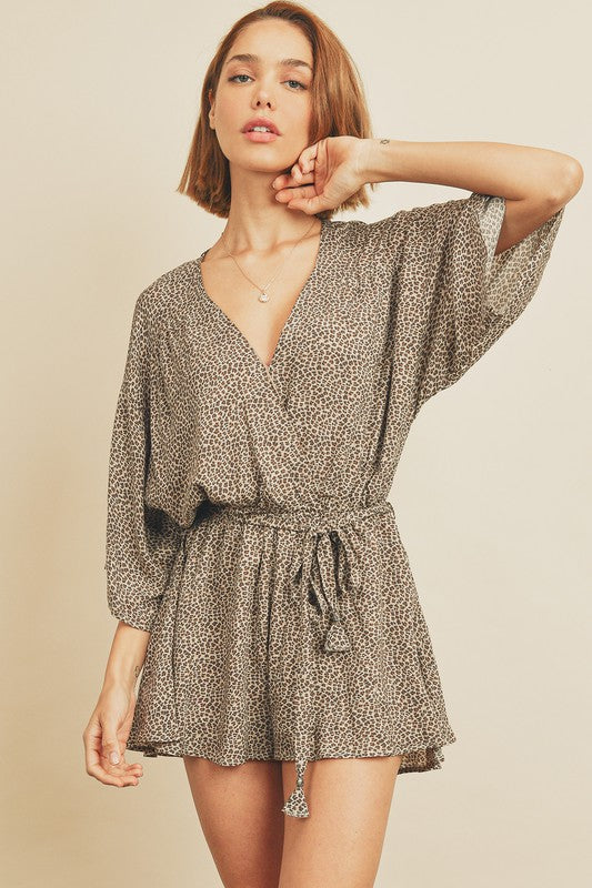 This dainty leopard print romper features a surplice neckline, 3/4 kimono sleeves, and elasticized waist with a drawstring closure. Partially lined and breezy fabric. Fits TTS