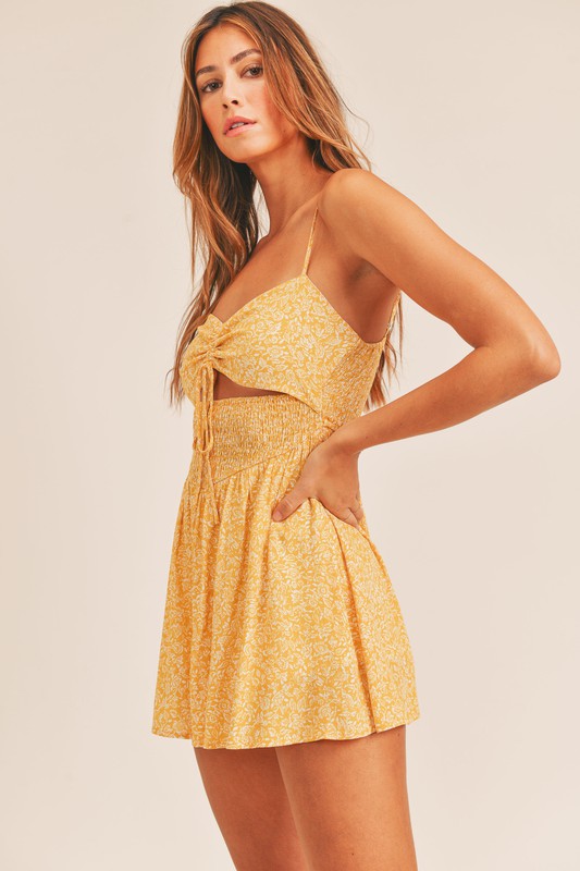 Gauze floral print mini dress with front cut out and smocked detailing. Front drawstring detail and back drawstring detail. Short lining inside. Adjustable spaghetti strap.