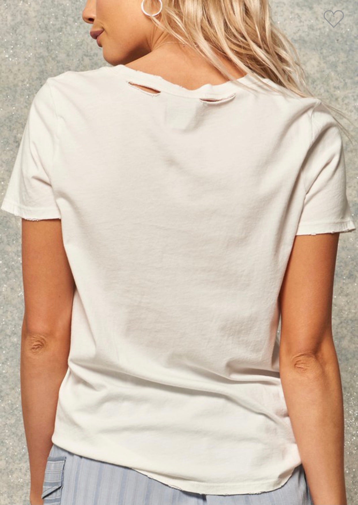 You don't think you need another graphic tee but, we assure you, you do!! This graphic tee is in a class all of her own. The perfect ivory color, the perfect amount of distressing, the perfect fit, the perfect softness, the perfect EVERYTHING! It looks super sexy with our Darby skirt and boots, and for a casual look try it bra tucked with our Jill jean shorts ohhh and maybe even our Lorna leggings and some combat boots. After all, the shirt does say "Rebel."
