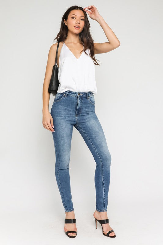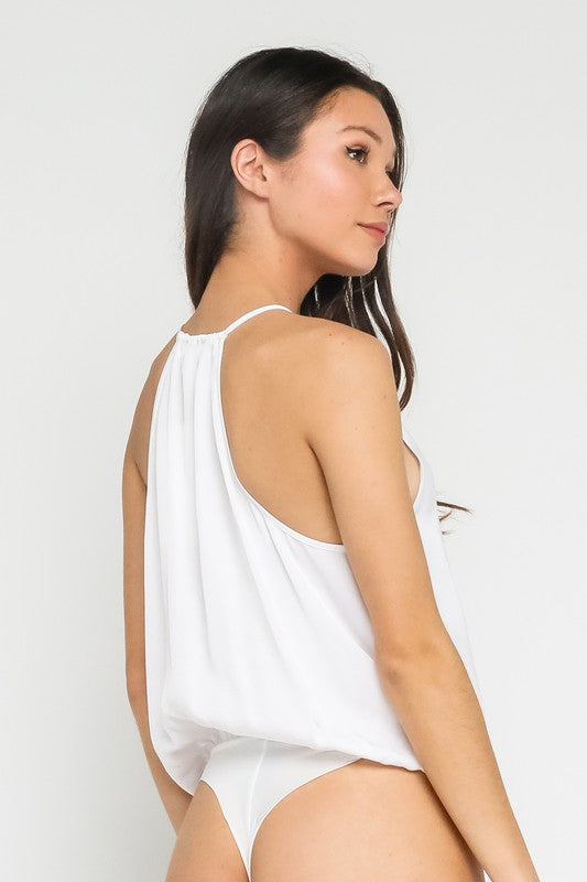 White satin bodysuit featuring a halter style fit and v neck. Straps are not adjustable. Thong bottom with button closure. Runs TTS.