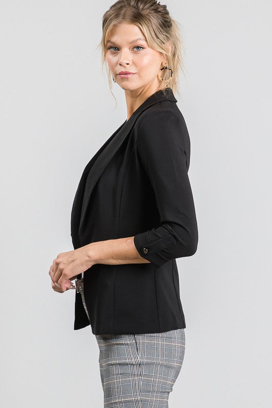 Our Kate Black Blazer is the perfect tailored jacket to complete a stylish and sophisticated look. We love it dressed up with our Kyra paperback shorts and black bodysuit, or dress it down with our Lydia distressed denim shorts and a graphic tee. This blazer will be a closet staple. It's a fitted blazer with 3/4 cuffed sleeves. It has just the right amount of stretch that will flatter any look.