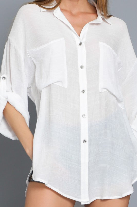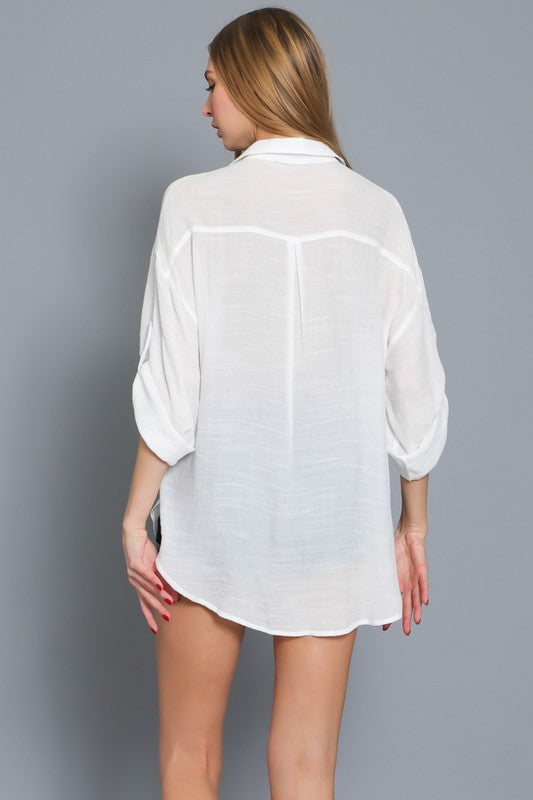 The most perfect white button down does exist!! White, collared, button down shirt featuring roll tab 3/4 sleeves and pockets. The side slits make this white button down even more perfect for front tying or for wearing as a beach coverup!!
