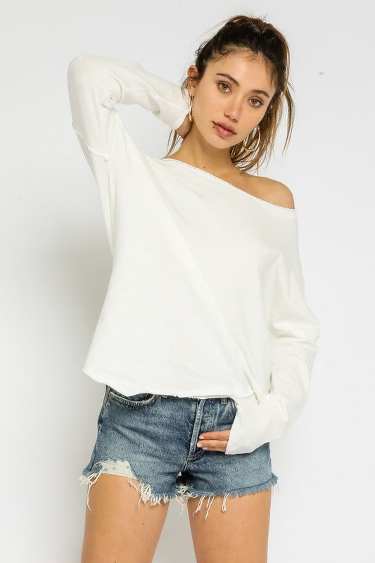 A white off the shoulder sweater that's lightweight enough for the warmer months, but cute enough for any time of year! Super soft with an asymmetrical hemline.